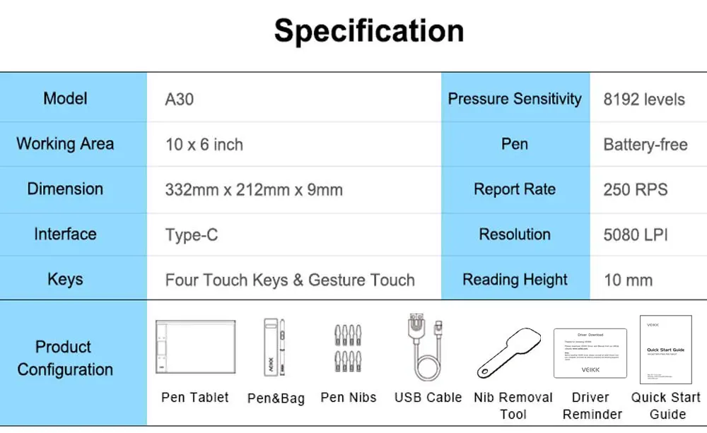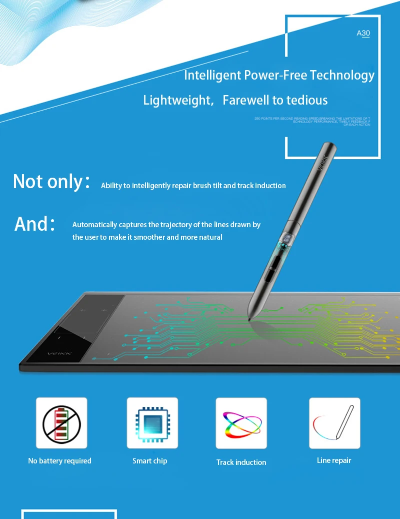 VEIKK A30 Drawing Graphic Digital Tablet Animation Writing Board 8192 Level With Battery-Free Pen 4 keys And Gesture Touch