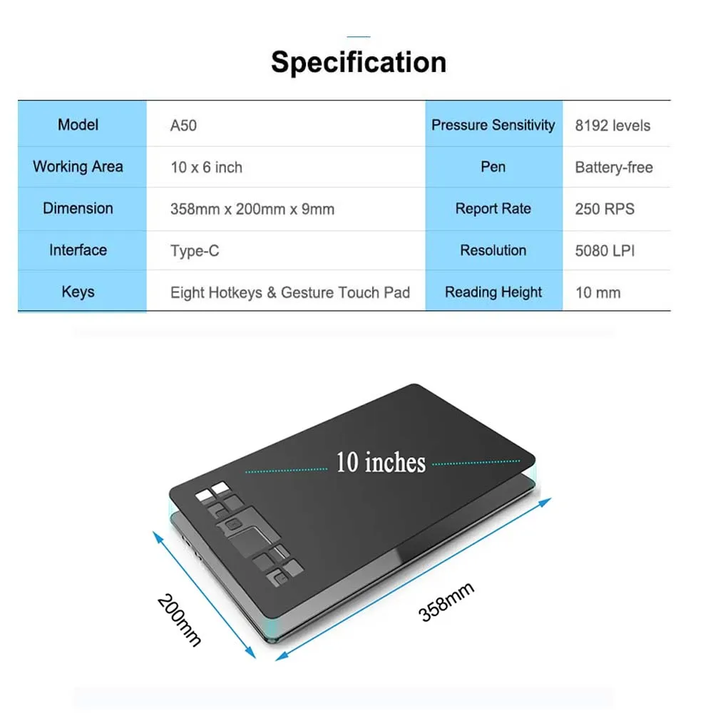 VEIKK A50 10 x6 inch Professional Graphics Drawing Tablet Type-C interface with 8192 Level Battery-Free for Digital Drawing Pad