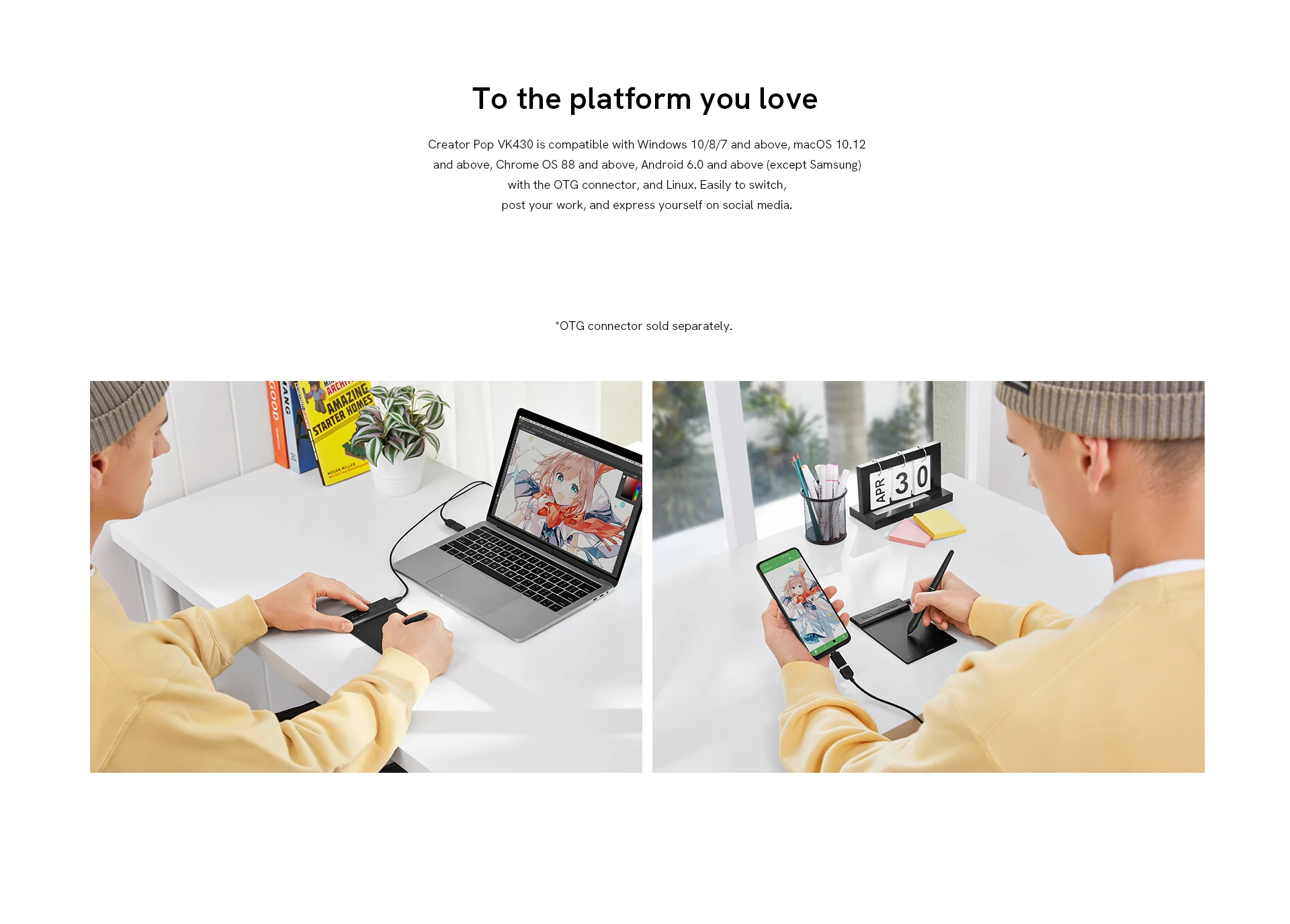 Easily switch among different programs: Creator Pop VK430 compatible with Windows 10/8/7, Mac OS 10.12 and above, Chrome OS 88 and above, Android 6.0 and above (except Samsung) with the OTG connector【NEED PURCHASE SEPARATELY】, and Linux.