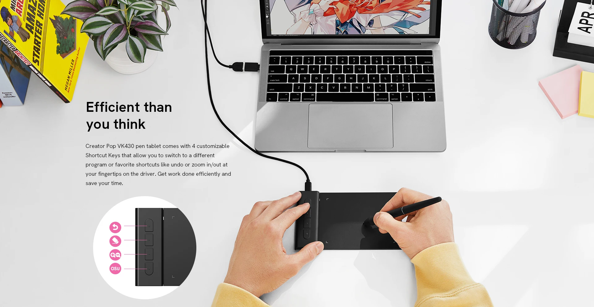 Efficient and Ergonomic: Creator Pop VK430 pen tablet comes with 4 customizable Express Keys that allow you to switch to a different program or favorite shortcuts like undo or zoom in/out at your fingertips on the driver. Get work done efficiently and save your time.