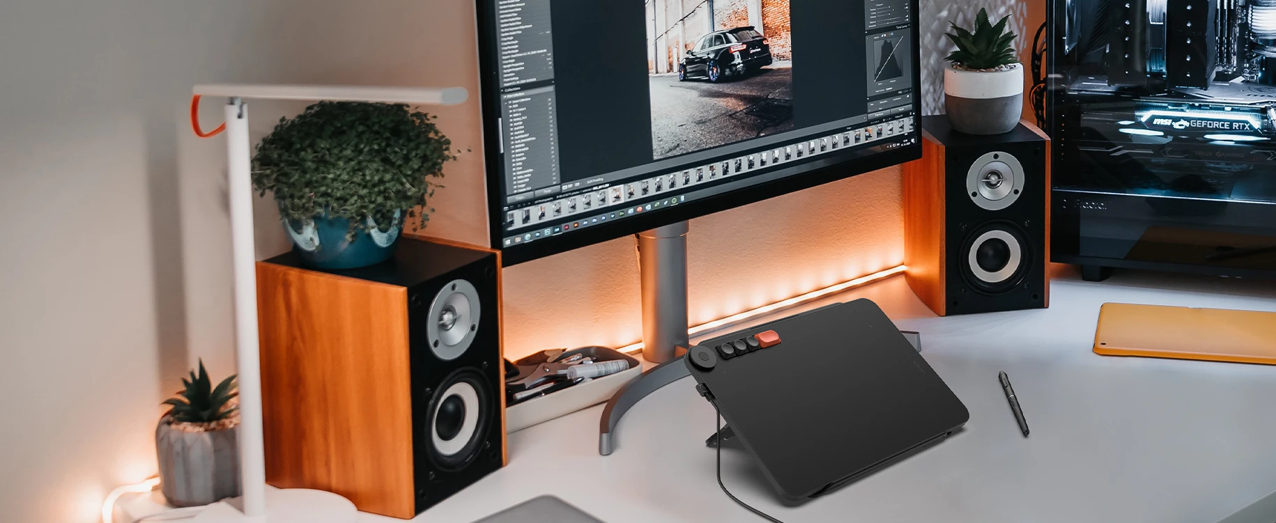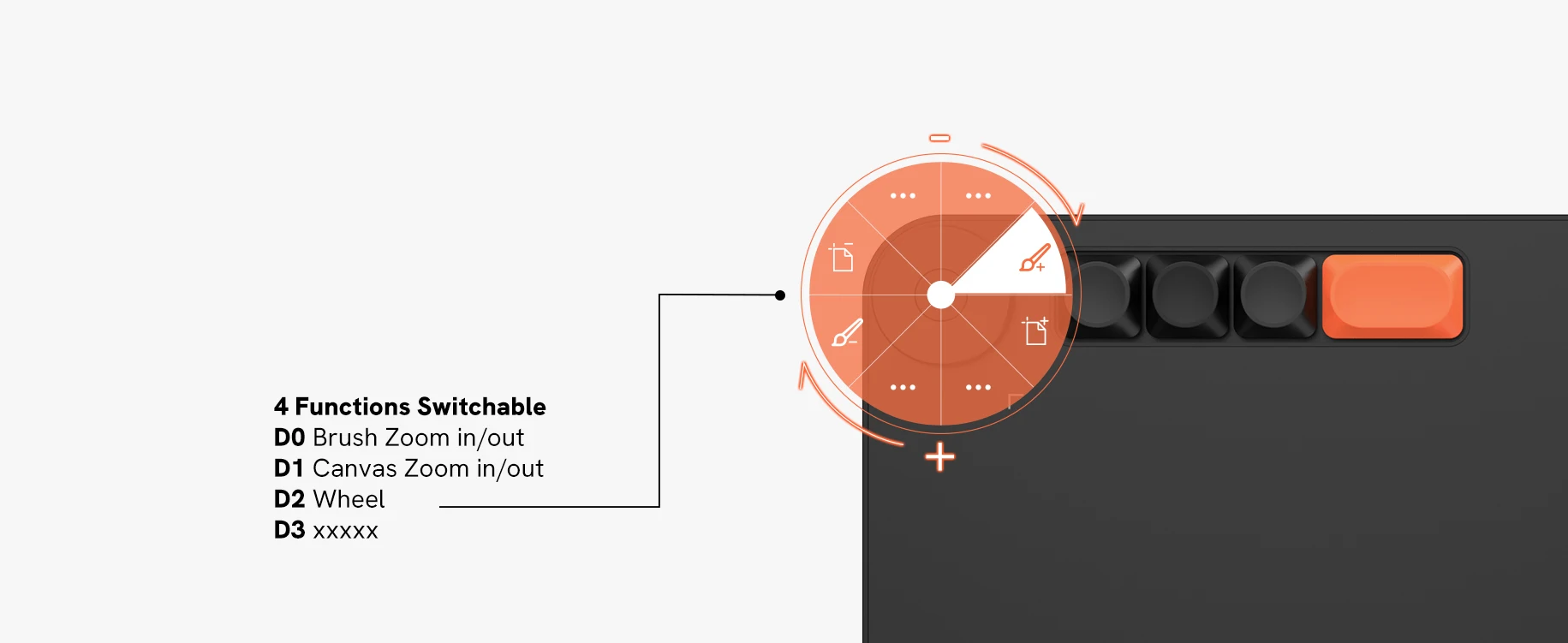 With the Dial alongside, you are able to rapidly adjust brush size, hardness, flow, and opacity, as well as perform actions like zooming in and out and dragging an image.