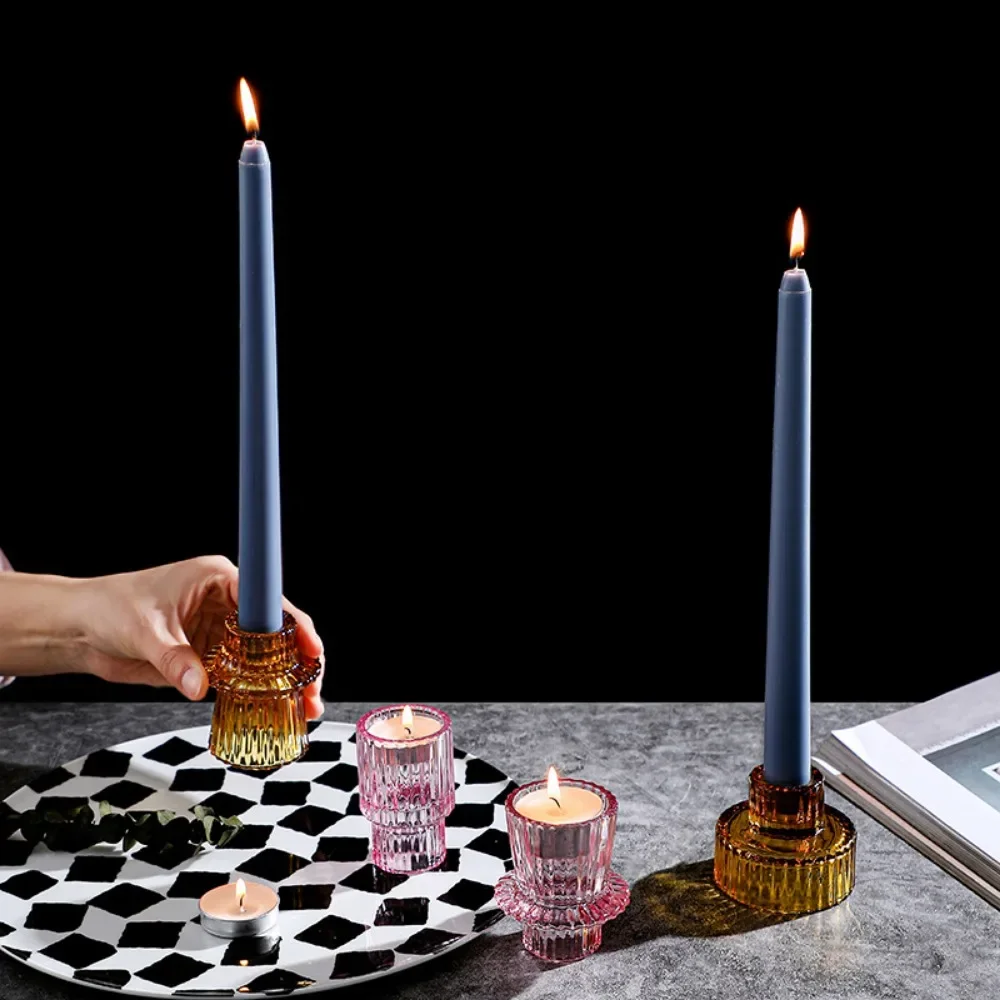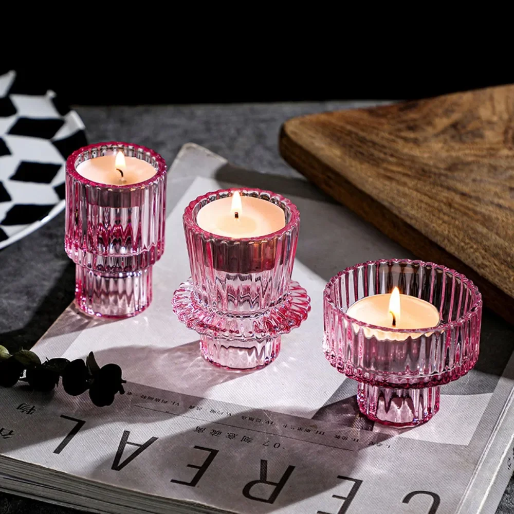 Vintage European Candles Holders Amber Pink Transparent Glass Candlestick Nordic Vertical Patterned Table Candle Stand