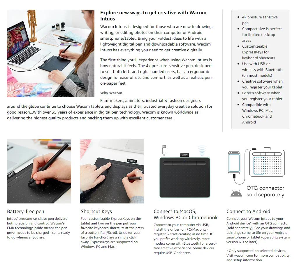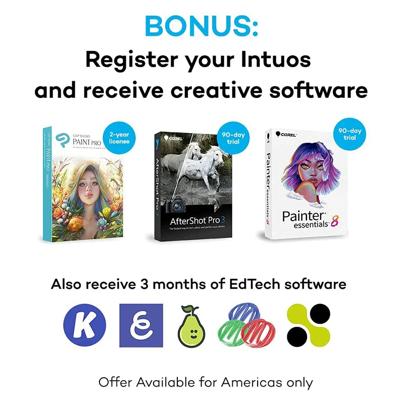 Creative Software: Register your Intuos on your Mac/PC to receive Clip Studio Paint Pro (2-years) and try out Corel Painter Essentials 8 & Corel After Shot Pro 3 for 90 days; Register with your Chromebook and receive Clip Studio Paint Pro (3-months)