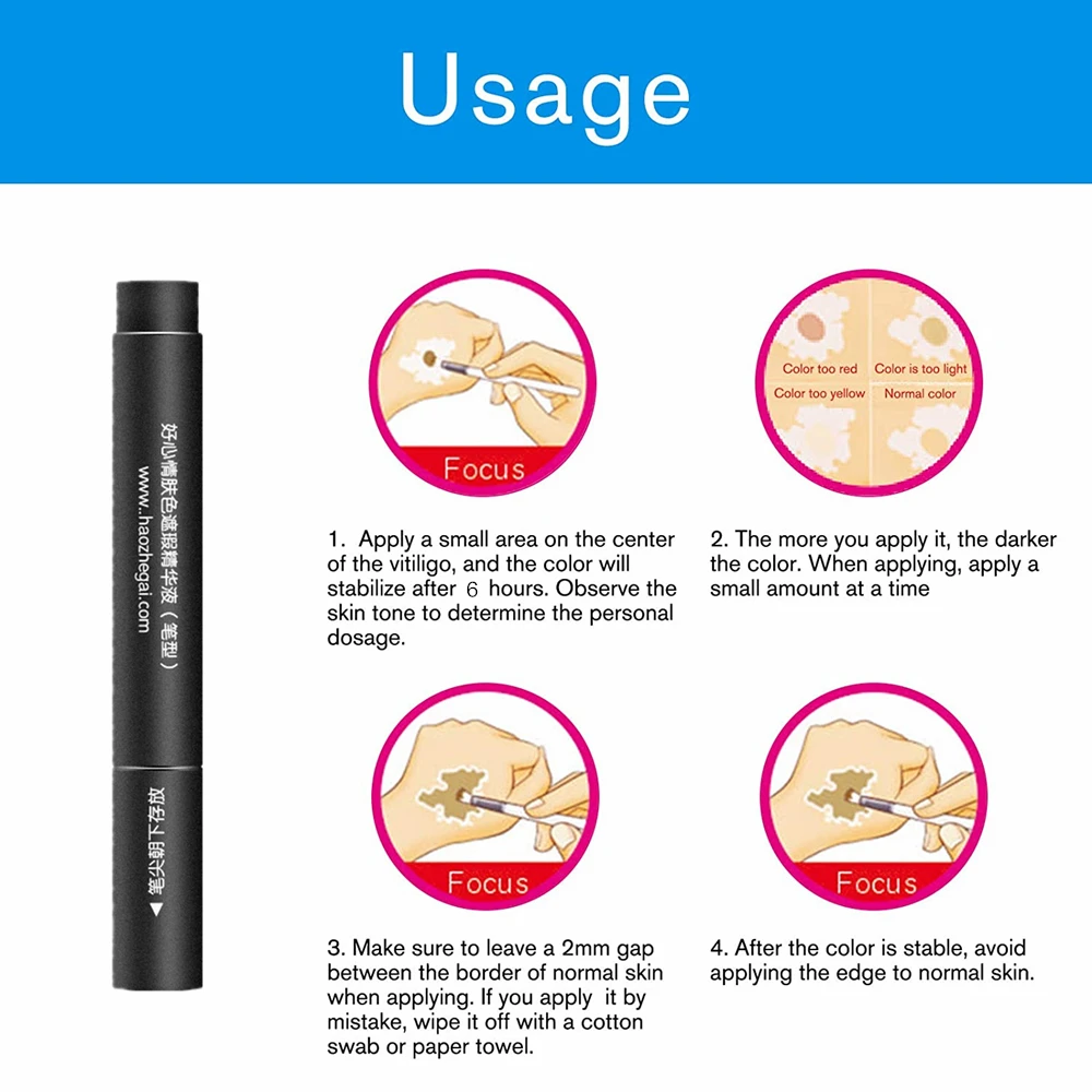 -First, the pen works best with even light strokes,apply gently onto discolored areas,don’t apply heavy pressure directly onto the tip.Please do not smear too much in the border of Vitiligo spot and normal skin,otherwise it won’t be close to the normal skin color.