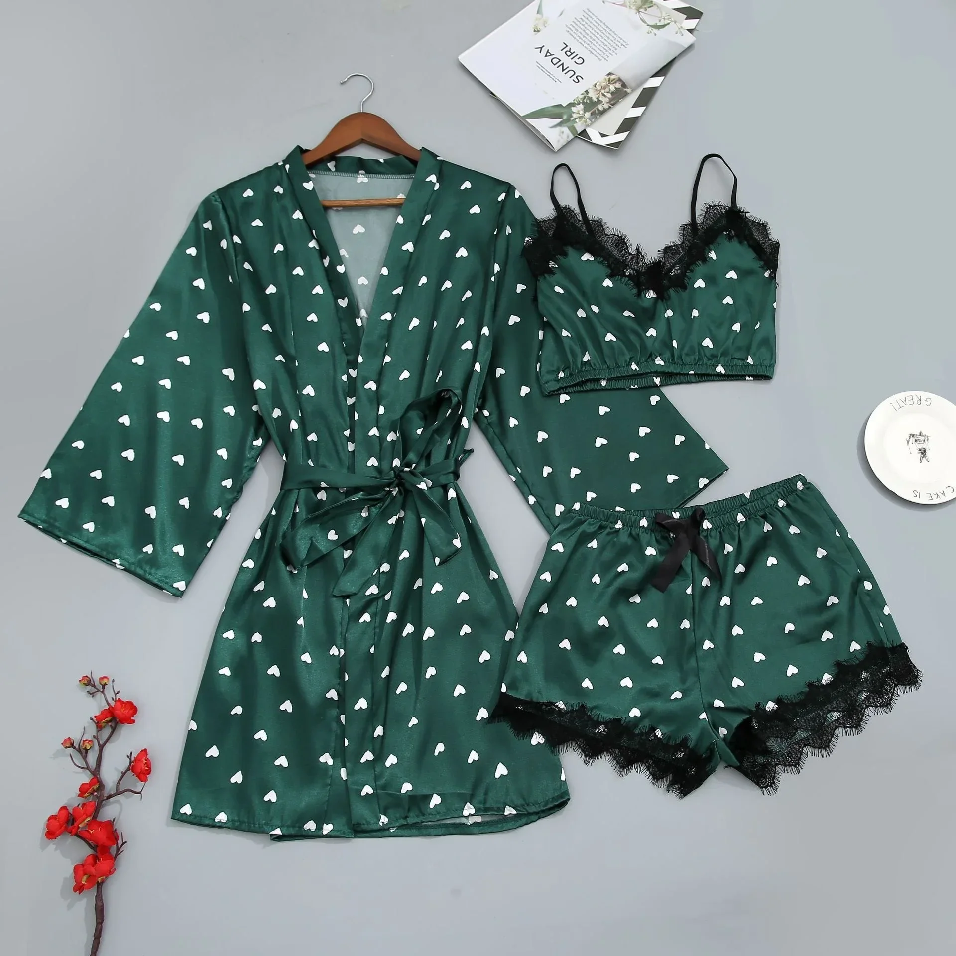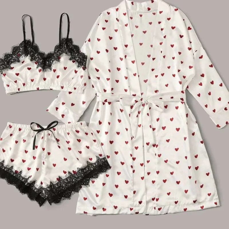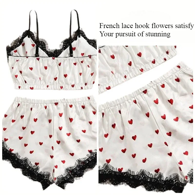 Women 2PCS/3Pcs Satin Ice Silk Pajama Set Heart Print Lace Sleeping Skirt Seamless Sexy Lingerie Homewear Pajama Short Sleepwear