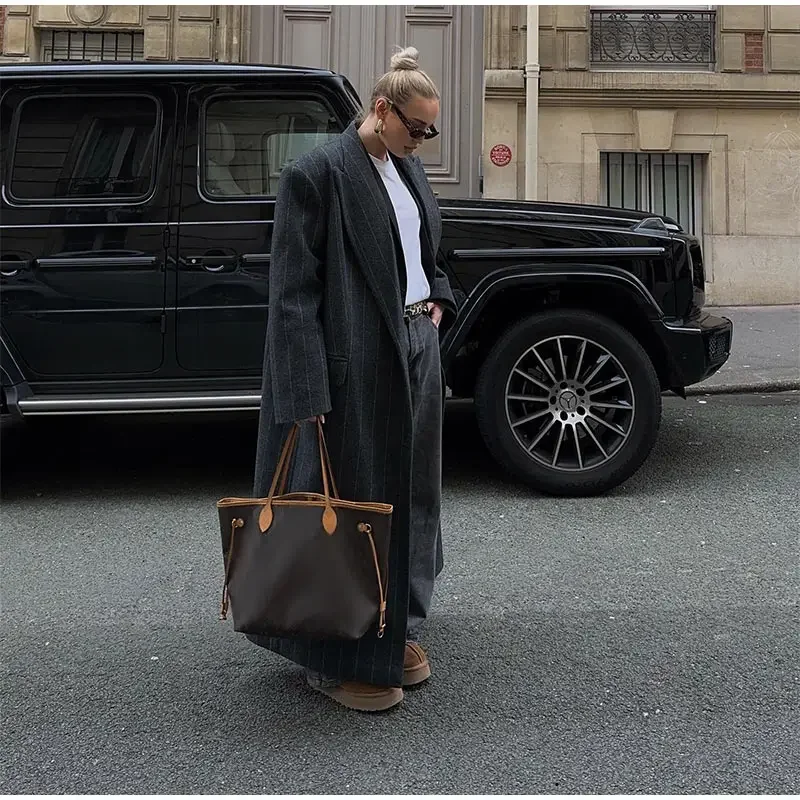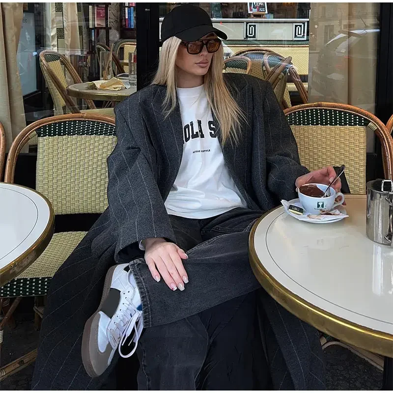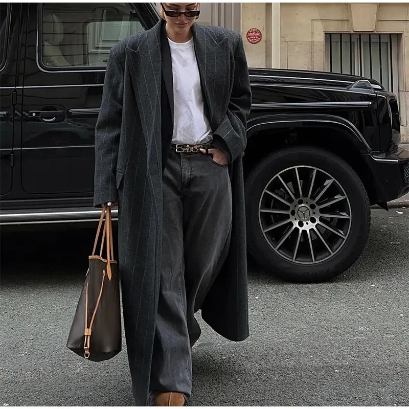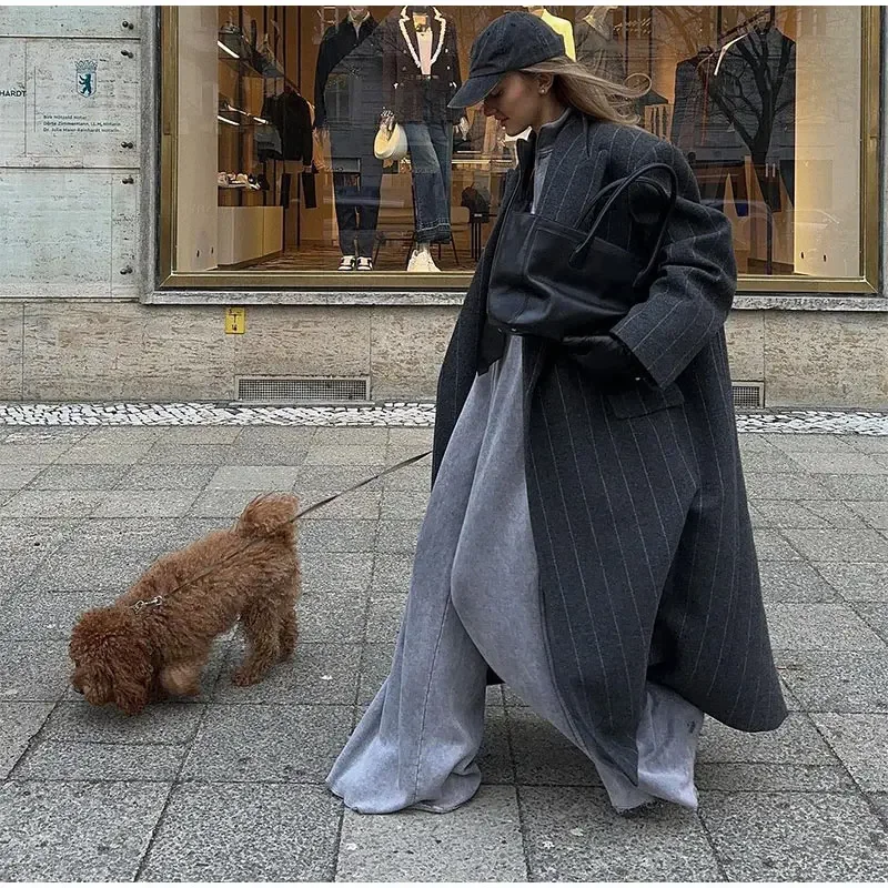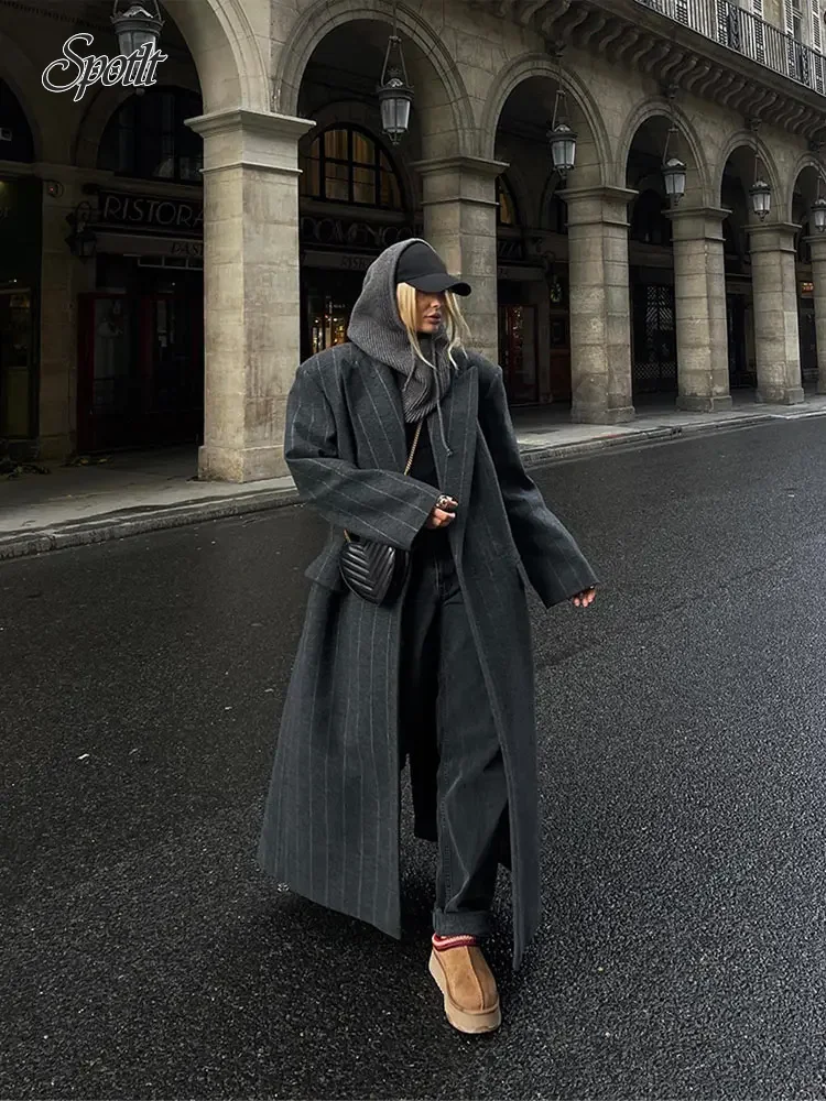 Women Dark Grey Stripe Wool Blends Overcoat Fashion Lapel Long Sleeve Loose Long Jacket Autumn Winter Lady New Street Outerwears