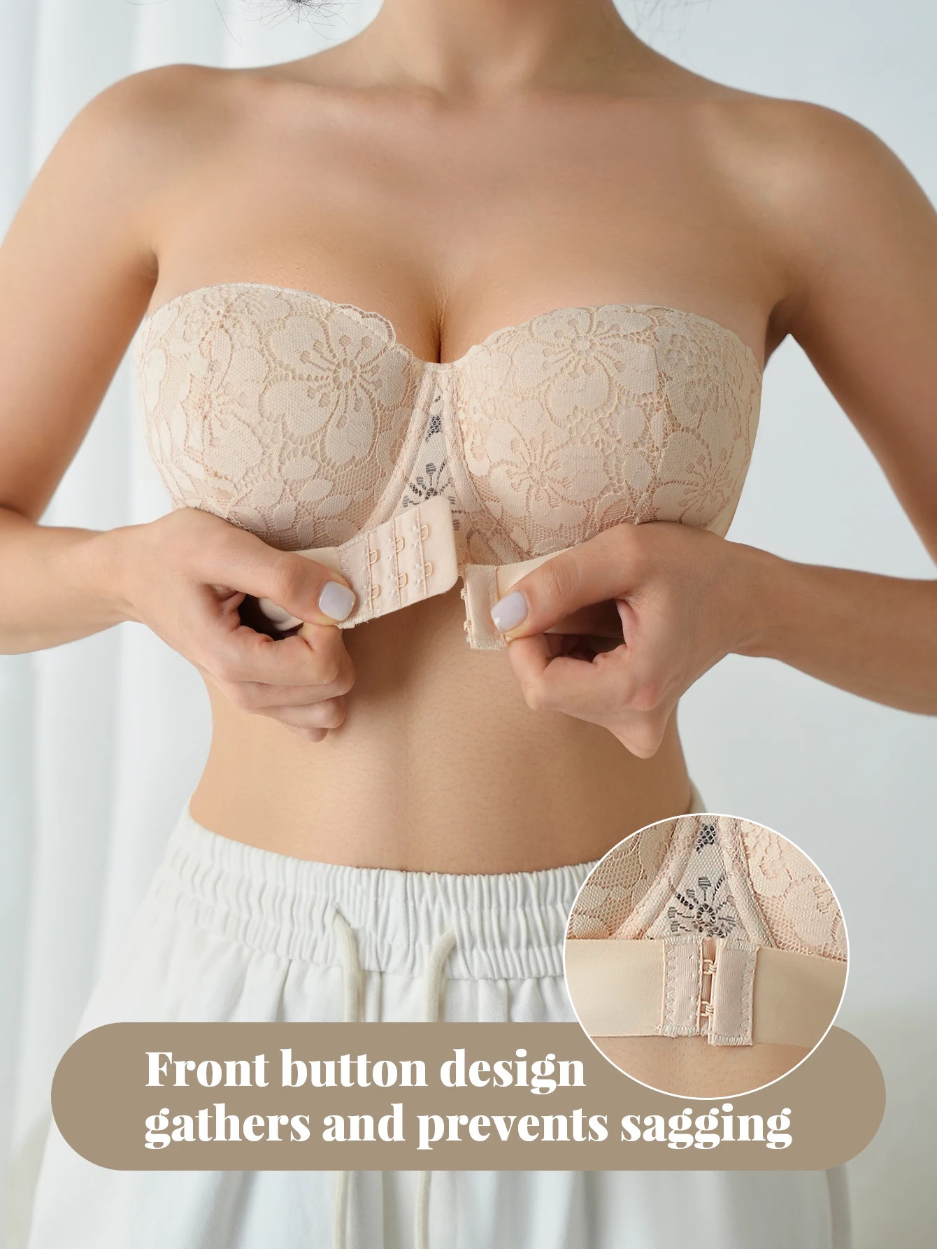 Women’s strapless bandeau sexy lace bra front buckle bra with steel ring push-up support breast non-removable padded bra