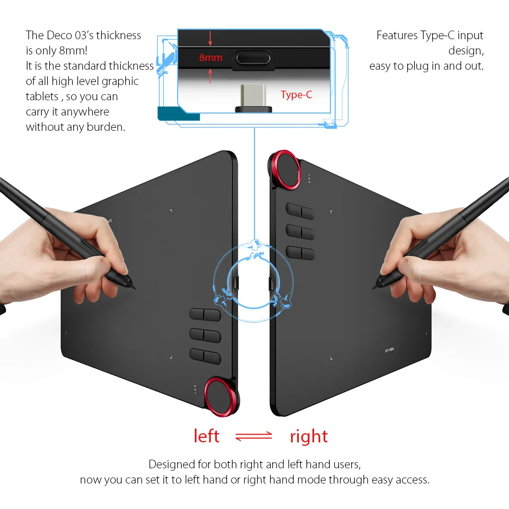 The Deco 03ās expansive tablet is big and brilliant, yet still designed to break through the limit between express keys and drawing area. Comes with a fully bonded drawing film, making the Deco 03 durable to use.